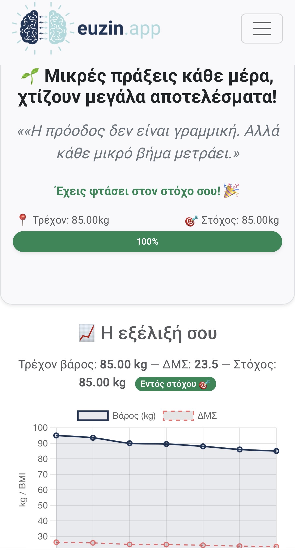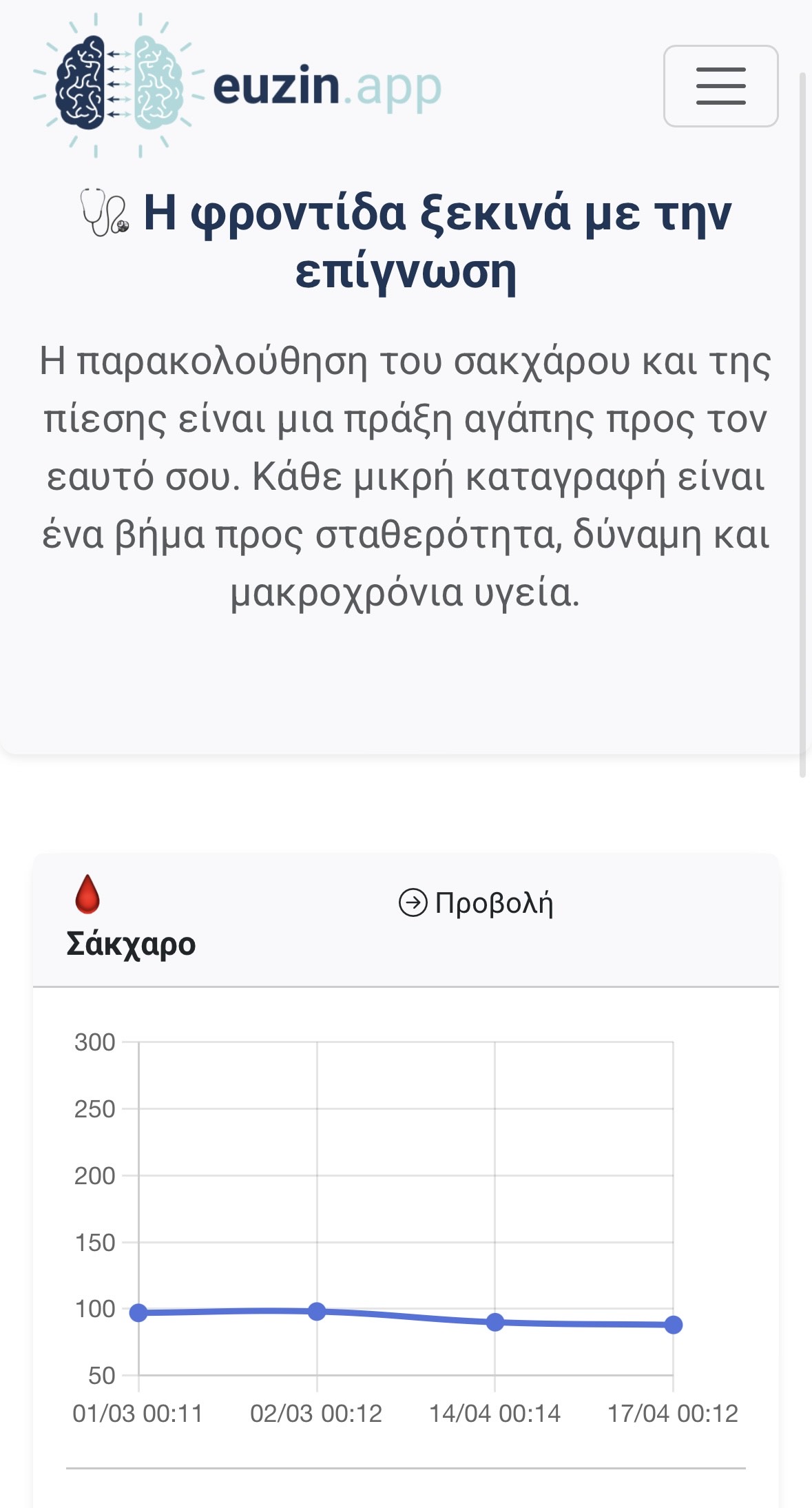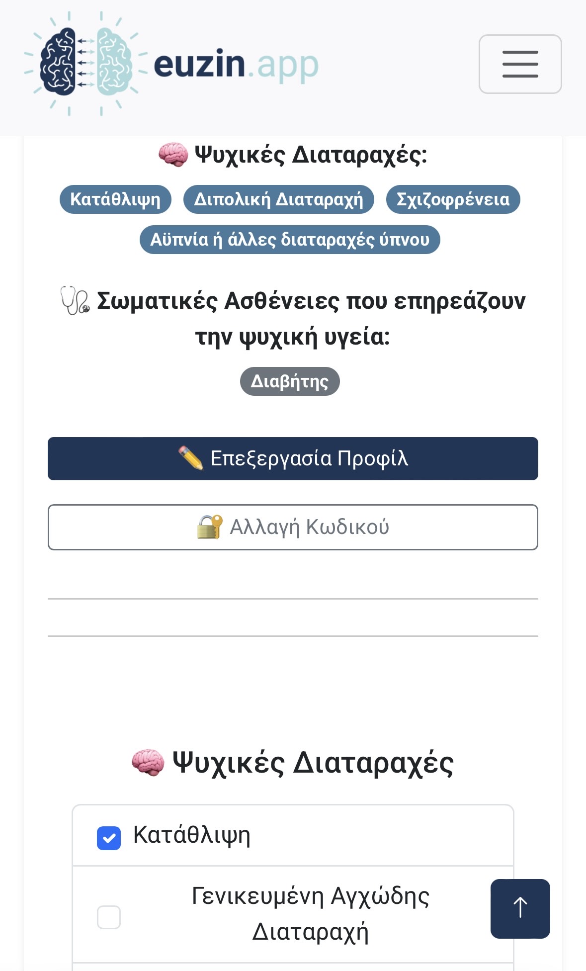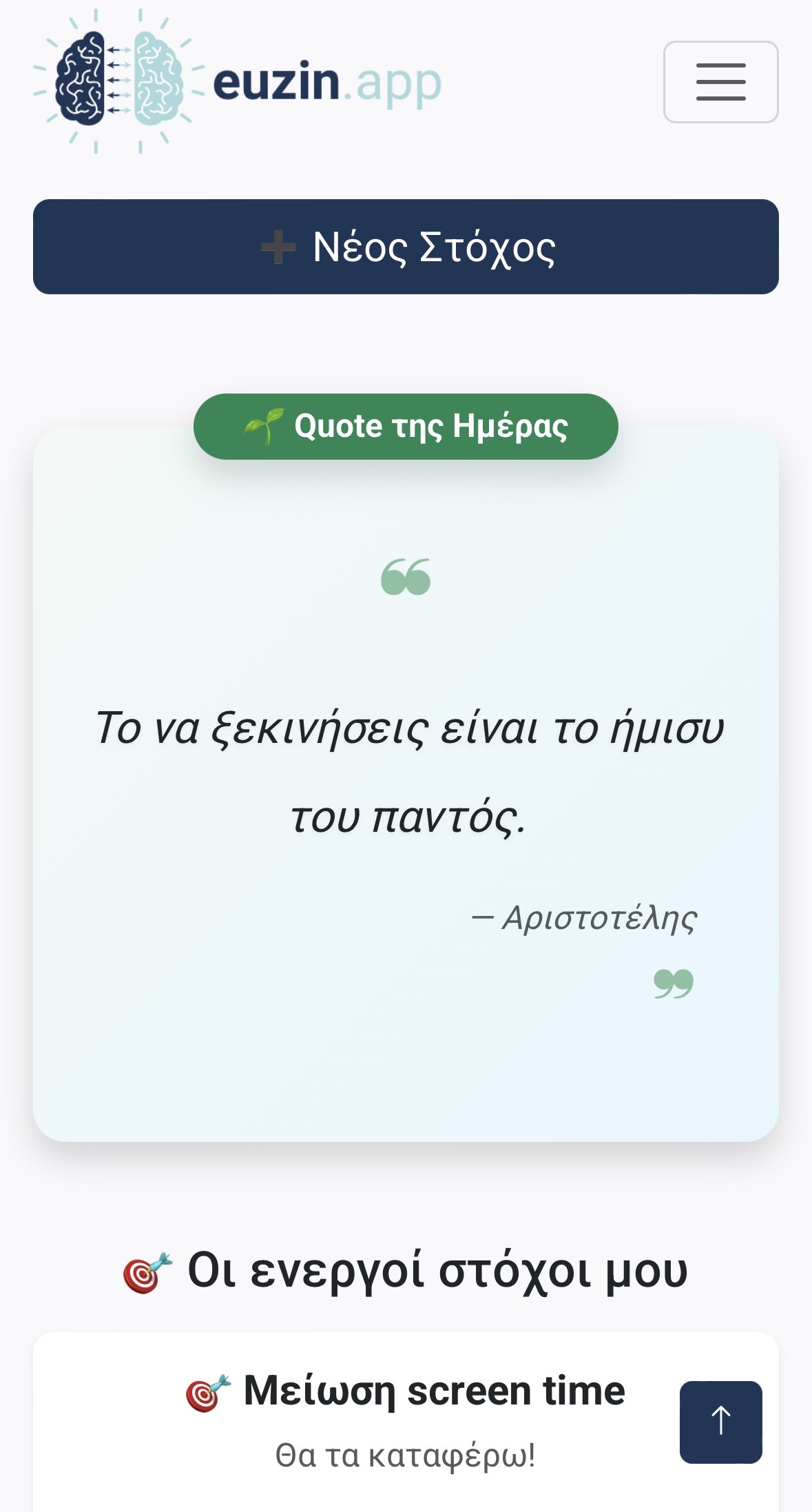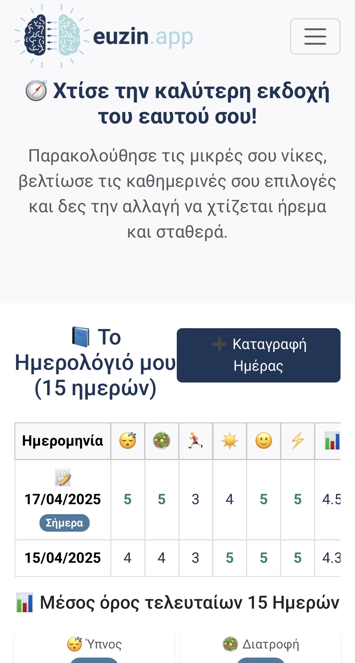 Το Euzin είναι μια εφαρμογή που βοηθά τους χρήστες να καταγράφουν τη φυσική και ψυχική τους κατάσταση καθημερινά, ενισχύοντας τη συνειδητότητα και τη μακροχρόνια υγεία.